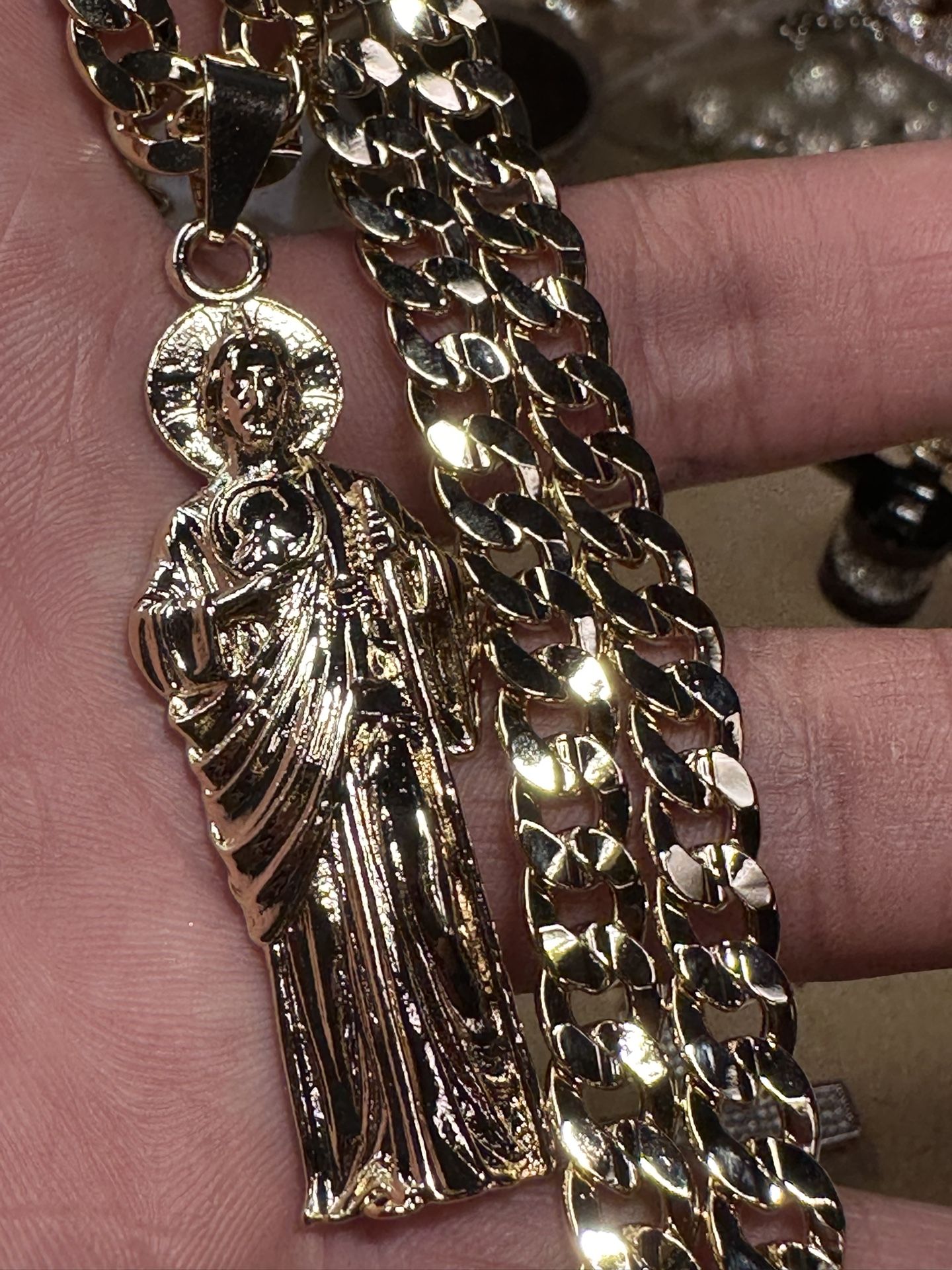 Brand New Never Worn 14k PVD Plated 6.5 mm 24" cuban necklace for sale with 2.00" Saint Judas pendant also PVD plated for sale PVD Plate - gold bonding process that plates micro layers of real gold onto necklace, ensuring it does not tarnish or fade if taken care of. Does have stamp Pick up only, or drop off within reasonable distance $80 for set $50 necklace & $40 pendant individually Thank you for looking