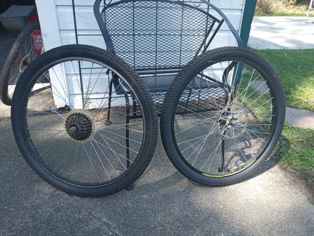 These rims are 24 × 1.95 back rim has 7 sprockets and front rim has disk breaks with very good tires.