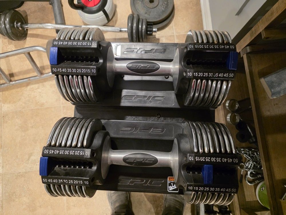 Selling a set of EPIC adjustable dumbbells. These dumbbells can be adjusted from 10lbs to 50lbs, making them perfect for a variety of exercises. They are in great condition and ready for a new workout routine!