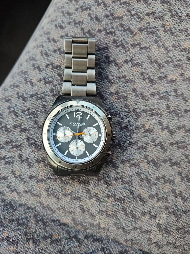 Title: Coach Men’s Bleecker Chronograph - Gunmetal Steel - WORKING Price: $70 (Recommended) Description: Selling a genuine Coach New York Men’s Bleecker Chronograph watch (Model 1(contact info removed)) in a sleek gunmetal stainless steel finish. This is a heavy-duty, pro-grade designer watch that works perfectly for both formal and casual wear. Features: * Precision Timing: Reliable quartz chronograph movement ensures accurate timekeeping. * Functional Design: Features three subdials (displaying hours, minutes, and seconds) and a dedicated date window. * Built to Last: Durable 42mm stainless steel case with an extra-durable mineral crystal. * Style: Distinctive black dial with gunmetal indices and a signature orange second hand for a modern pop of color. * Water Resistant: Rated up to 99 feet (30m), suitable for daily use. Condition: The watch is currently running and keeping perfect time. It is in good pre-owned condition with some light, honest wear on the band and bezel that adds to its character.
