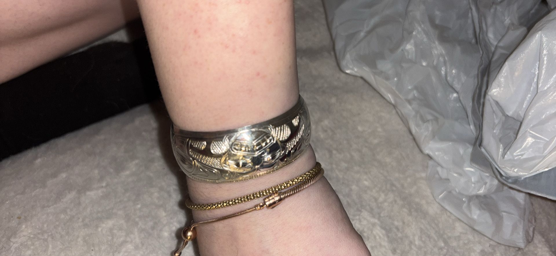 Beautiful silver tone cuff bracelet. Has intricate engraved design Has artist signature on inside.