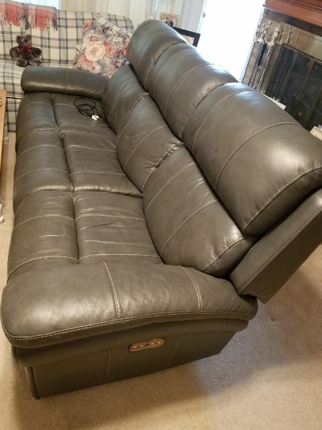 3 seat leather couch with matching leather recliner. Completely electric control and USB ports on sides of couch and recliner. Matching set, originally $1,800 will accept best offer isn’t going to fit in my parents house moving back in.