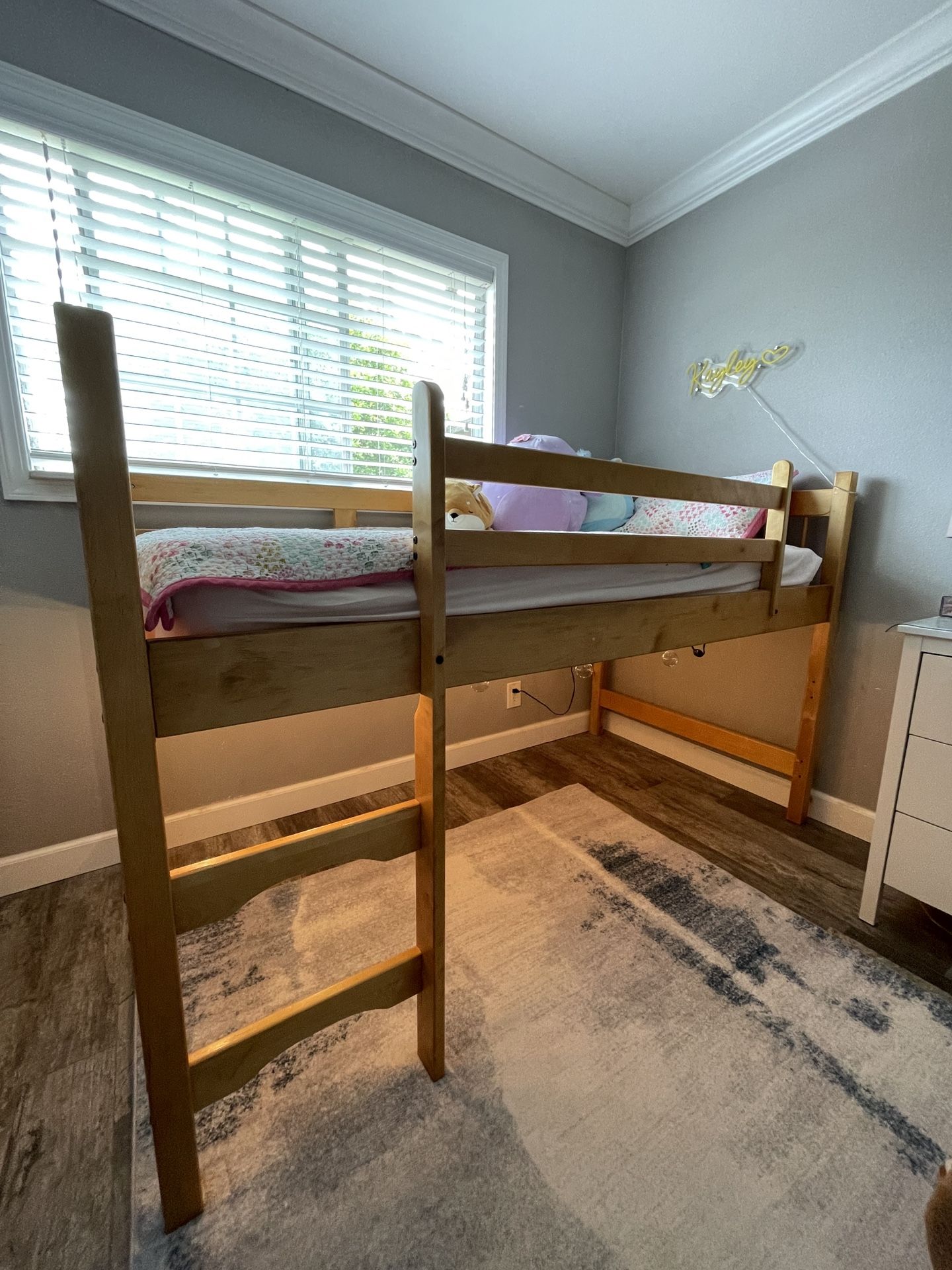 Twin loft bed very well made. Not pictured is the slide attachment which is included. Currently wrapped & stored away. Stairs/slide can be placed on either end depending on how you prefer the placement. Mattress is free if you want as well.