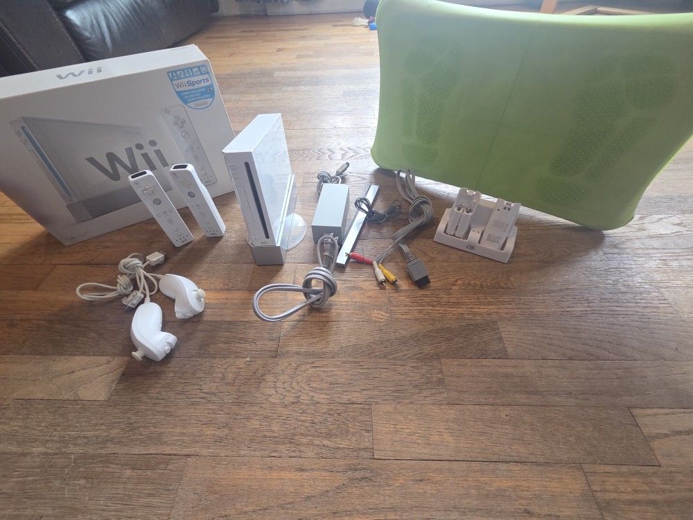 Nintendo Wii video game console bundle Includes the main console unit, two Wii Remotes, two Nunchuk controllers, and a charging dock - one back corroded. Features motion-control technology for interactive gameplay. This specific model (RVL-001) supports GameCube backward compatibility. Connections include a sensor bar, power supply, and AV cables for television output. 8 game disks + 2 SD cards. I don't know what's on them. Comes with Wii Balance board & Wii golf club - foam does not hold. Has all the paperwork & manuals in the box.