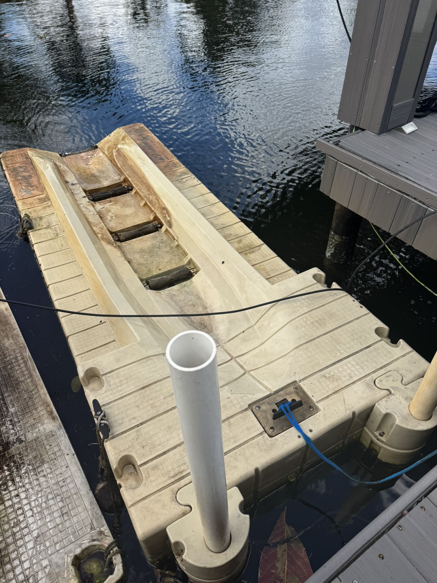 Floating dock for jet ski or small boat, I had a 3 seater large jet ski on it. Has roller wheels for easy launching. Comes with support brackets and poles. Pick up only. It’s too heavy to remove from the water unless u have 4 guys. Easier to tow with a small boat.