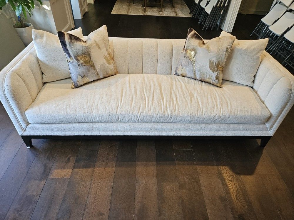 White Booker Furniture Fabric Couch is a beautiful piece. Includes pillows shown in picture. The white fabric has a stunning silver sheen to it as well. This is a new couch, barely used.