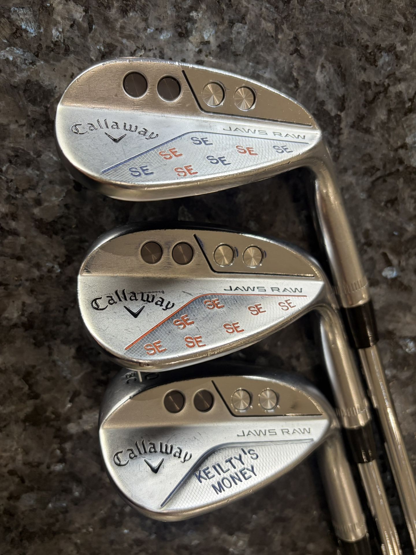 Callaway Jaws Raw Wedges with personalized stamping. 50 and 54 degrees both with 10 degrees of bounce in S grind, stamped with "SE". 60 degrees with 8 degrees of bounce in C grind, stamped with "Keilty's Money". Clubs are in good overall condition with KBS Tour Lite 95 shafts and like new Golf Pride Tour Velvet grips. $125