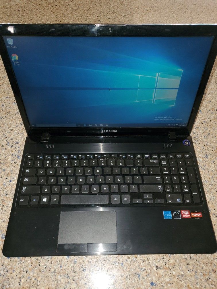 Samsung laptop model 355V4C with AMD A8 and 10 GB RAM and 250 GB HD, running Window 10 and Microsoft Office. Comes with charger.