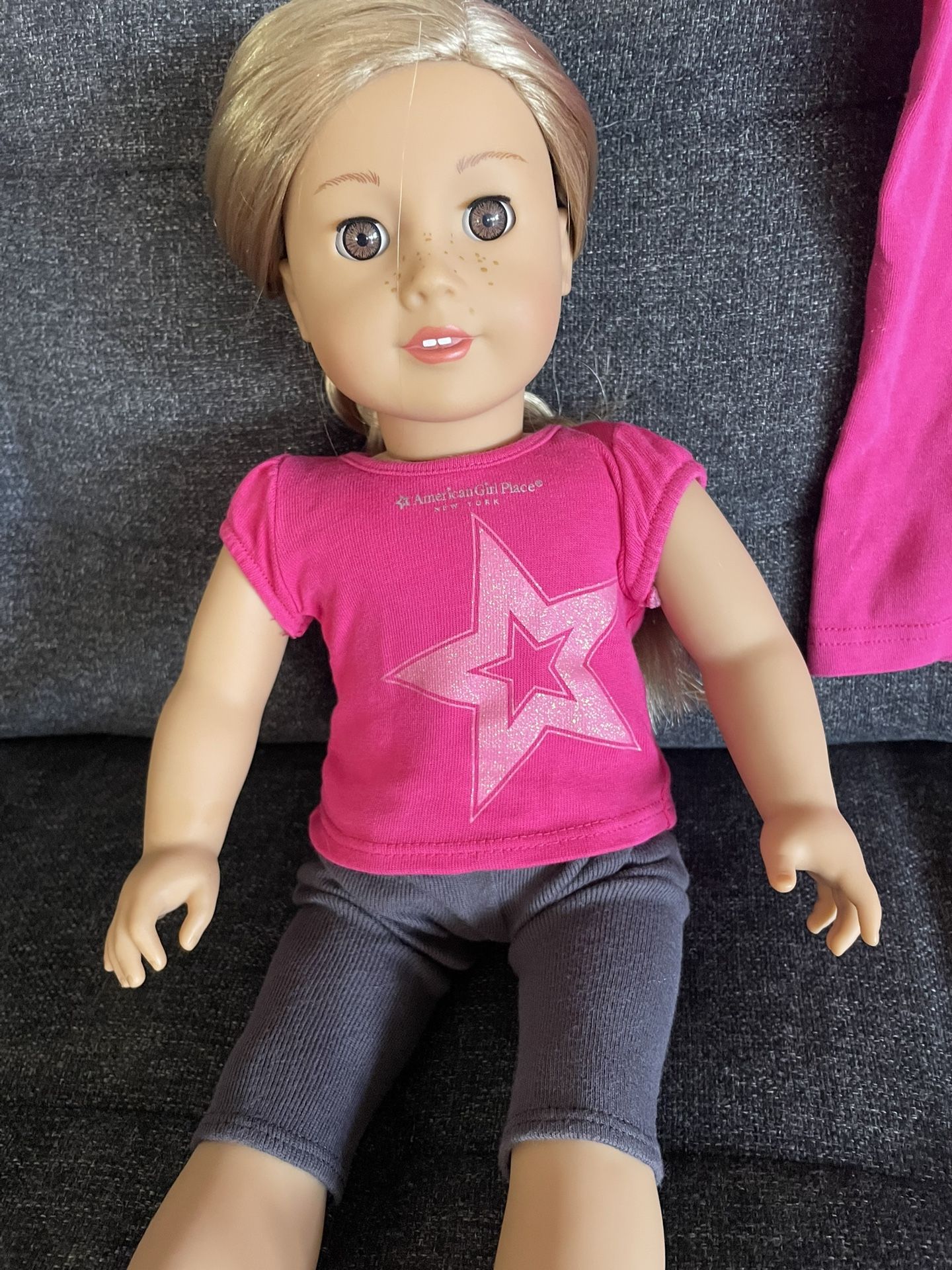 Very gently used doll in an excellent condition. The hair is soft and untangled. The matching T-shirt is size XS. My kid got it when she was 5 and wore it for two seasons. We lost one shoe, so no shoes are included.