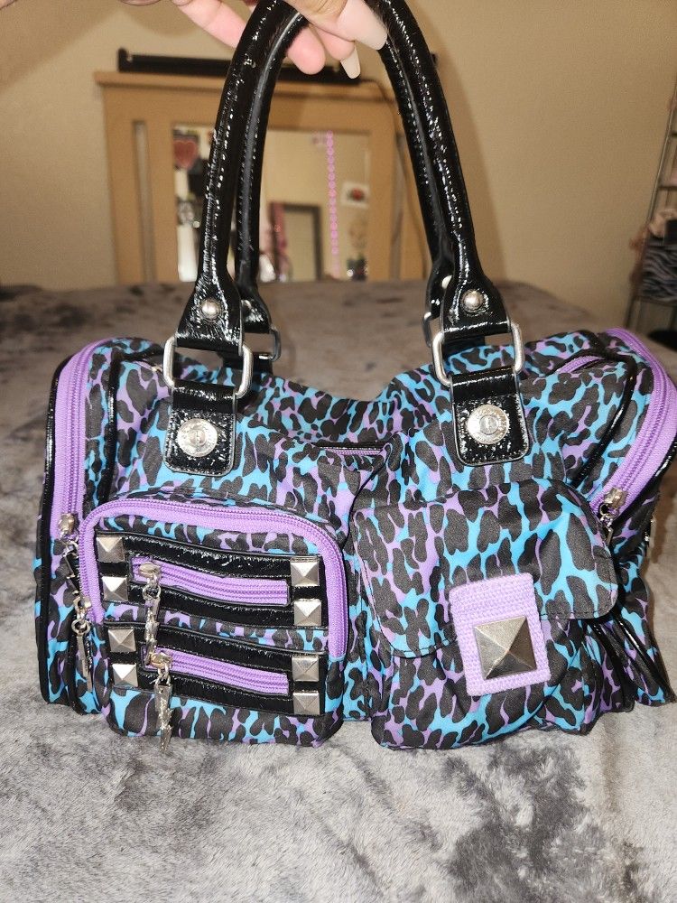 -Unique Black pink and blue leopard print -3 zippered pockets front left -Right front pocket is a buttoned pocket -Each side has a half zippered pocket with a zipper pocket in front of each side pocket -Last zippered pocket is on the inside. - Each zipper has a lightening bolt charm on zippered pockets. - There is one buttoned pocket in front - In Total there is 8 zippered pockets and one buttoned pocket. -All pockets are bigger and deeper than they appear. - The only wear and tear is along the handles shown in pictures but even those are very small and might be hard to even see. -Used it once and got many compliments on it