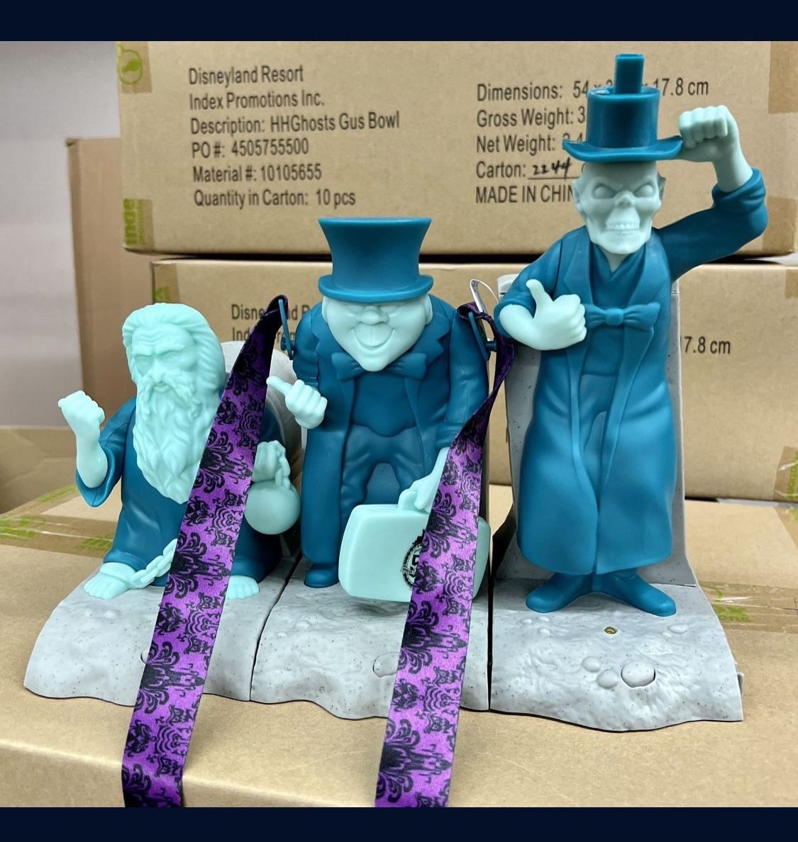 Disney Parks Haunted Mansion 50th Anniversary Hitchhiking Ghost Popcorn Bucket Sipper Dessert Tray Set of 3 ~Light Up Musical~ THEME PARK EXCLUSIVE~ AVAILABLE ONLY FOR THE 50 ANNIVERSARY OF THE HAUNTED MANSION ON AUGUST 9TH, 2019 LIGHTS, SOUNDS AND MUSIC POPCORN BUCKET, SIPPER, & DESSERT HOLDER PLAYS THE "GRINNING GHOSTS SONG" AND EACH FIGURE LIGHTS UP Phineas Popcorn Bucket — This popcorn bucket has a tombstone that tilts out to hold the standard-issue cardboard carton of popcorn. His tombstone reads: “Rest in Peace, Professor Phineas Plump, His travel plans have hit a bump.” The popcorn bucket plays the “Grim Grinning Ghosts” Haunted Mansion theme song. The Ezra sipper — This cute little sipper has a foldable straw that extends from his top hat. His tombstone reads: Ezra Bean, “Unluckiest hitchhiker we’ve ever seen.” The Gus Dessert/Beignet Holder — This one holds a bag of beignets (Mint Julep Bar) or fritters (Royal Street Veranda) in the extendable tombstone. His tombstone reads: “Here lies Good Ol’ Gus | Hitchhiking because he missed his bus | RIP.”