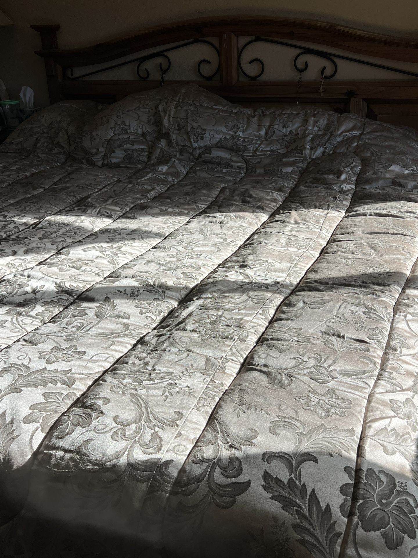 Queen size bedding set -Reversible with two pillow shams and three cushions. The color is like a bronze gold tones. Out of the package but never used. Exact cash only accepted. Area of SW 147 Ave and Coral Way in Miami.
