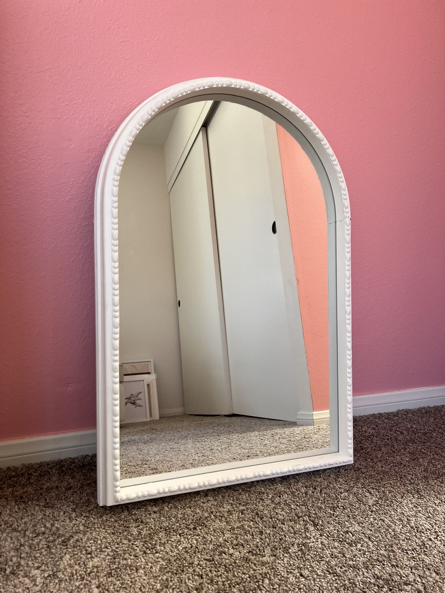 White mirror for sale. In great condition. No cracks on glass, only small crack on side of frame (see photo). 29 inches tall, 19 inches wide