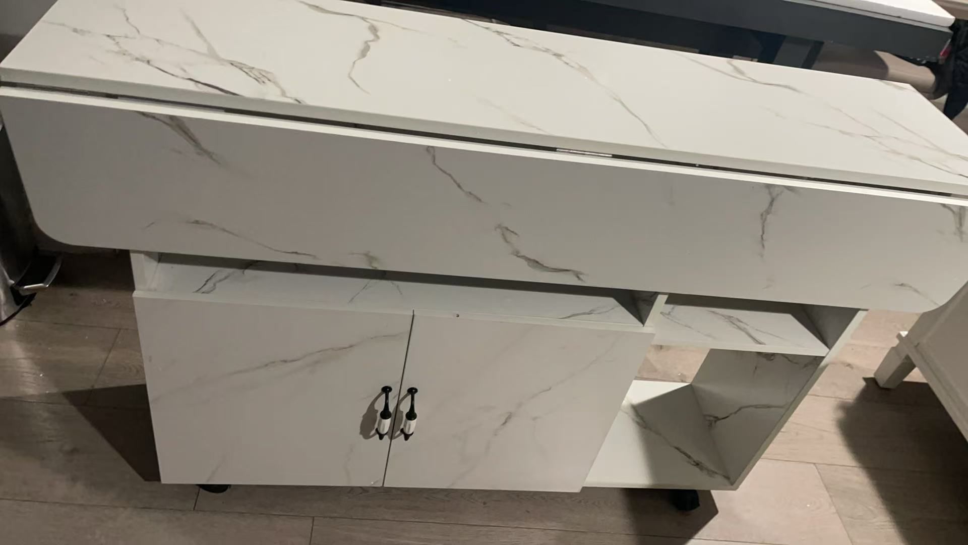 New 47" Folding Table with Storage Shelves & Wheels, Multi-Functional Foldable Desk for Small Kitchen Dorm Office, White