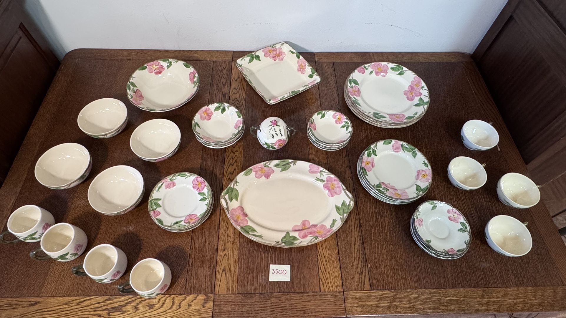 This set looks almost new, but since it didn’t come out of the box, we have to say used. It’s a 40 piece mixed set put together with different stamps on the back. There could be a slight chip here or there in different things. We looked carefully, but it could happen. There is one chip in the top of the sugar bowl, pointed out with a picture. 4 fruit bowls 4 dinner plates 4 berry bowls 4 tea cups 4 saucers 4 cereal, bowls 4 coffee cups 4 bread plates 4 salad plates 14 inch platter 9 inch serving bowl Square deep dish, serving platter Sugar bowl