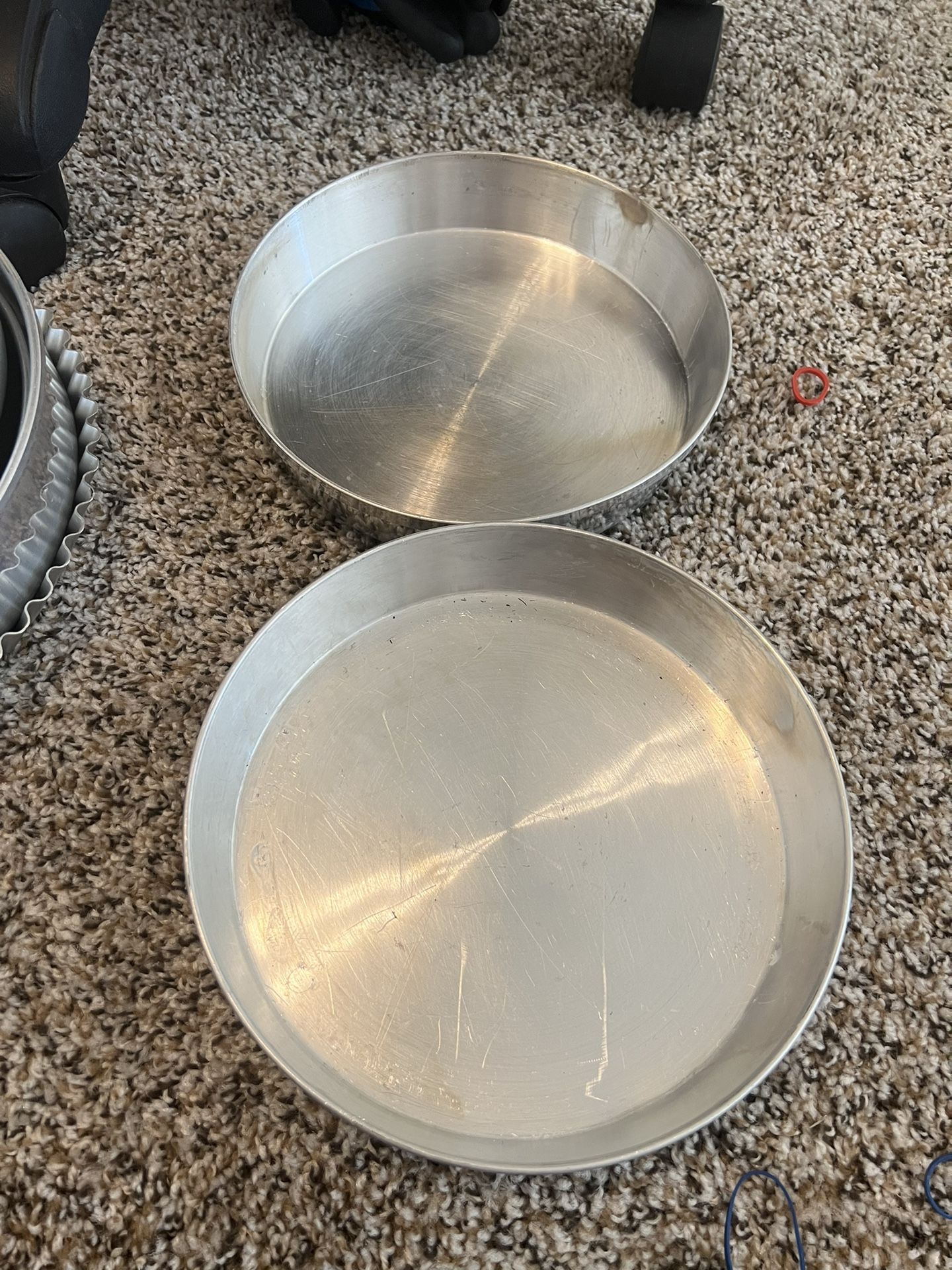 5 cake tins and one pie tin. Two 8 x 1 1/2, one 9 x 1 1/2 , one 10 x 2