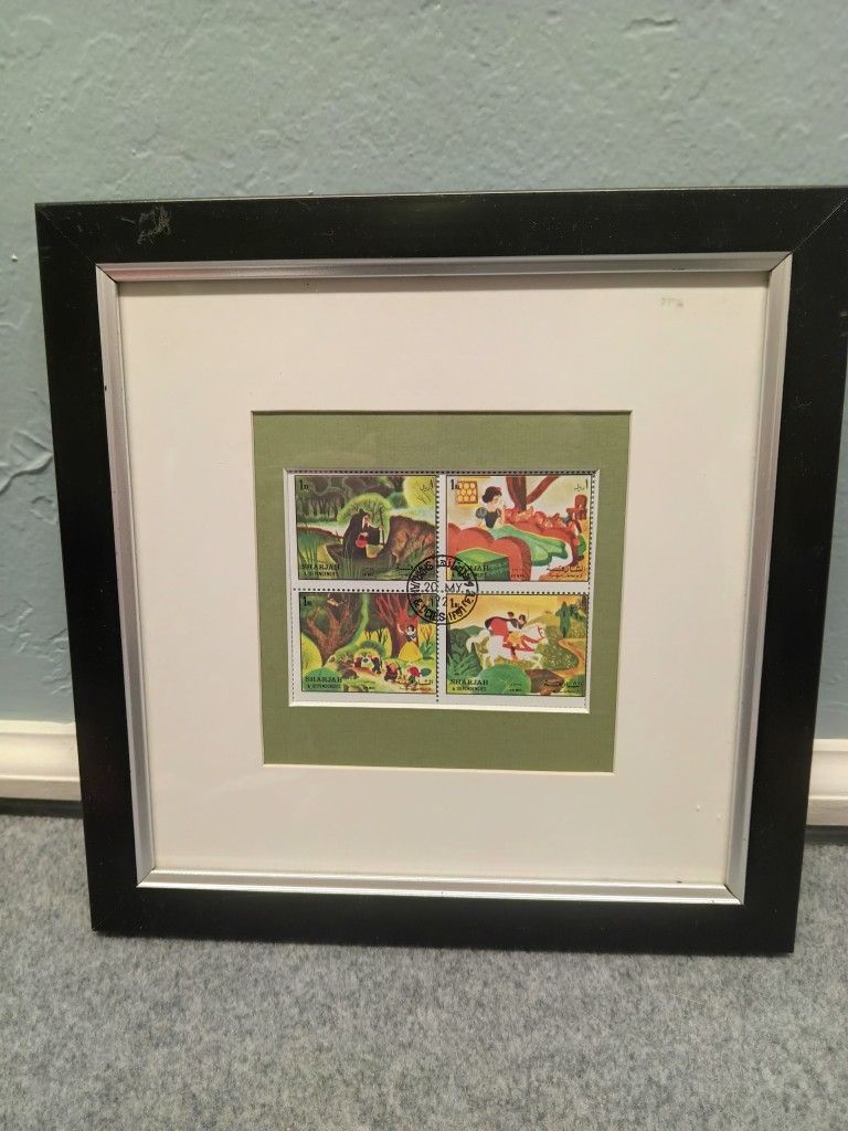 4 set of vintage snow white stamps Stamps are from sharjah independecies and date back to 1972 they are matted and framed and are in perfect condition Professionally framed and ready for hanging, The frame measures 10x10 Available for pickup in Wildomar or willing to ship S