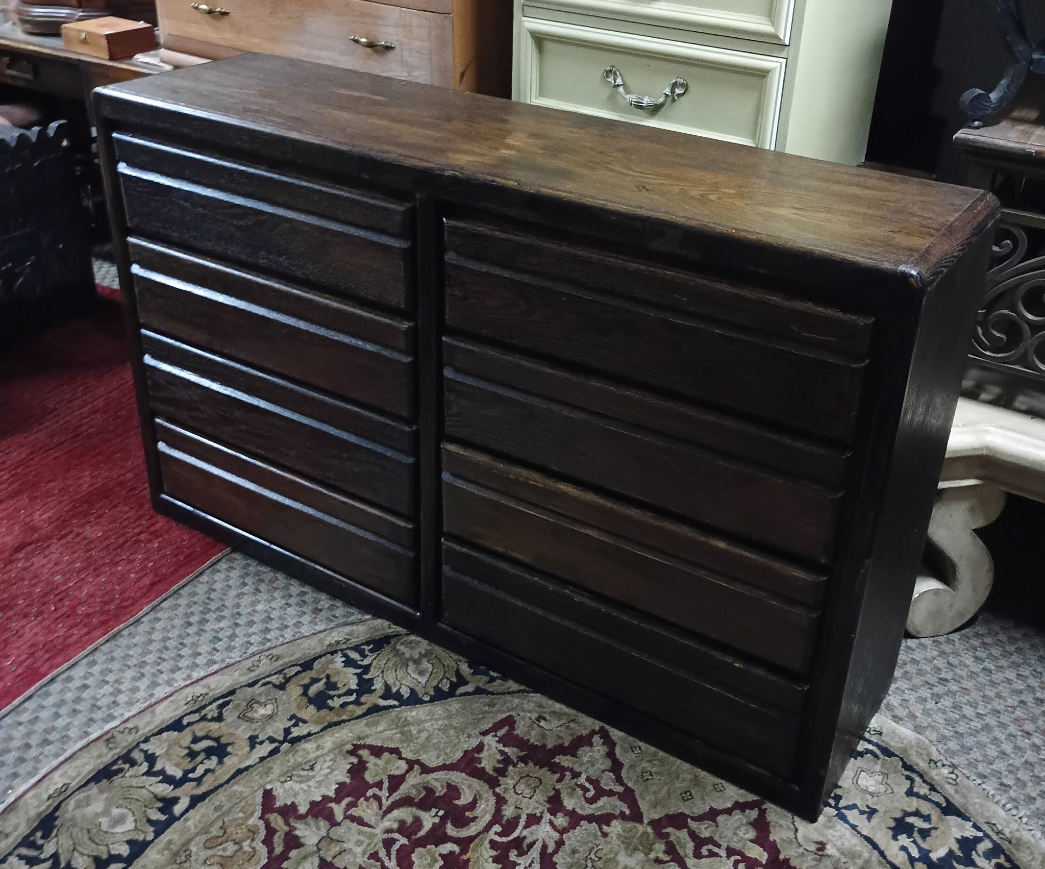 Solid wood dark brown stone wash finish 8 drawer storage dresser all drawers slide smooth 17x62 inch top 38 inches tall scratches from normal wear good condition $140