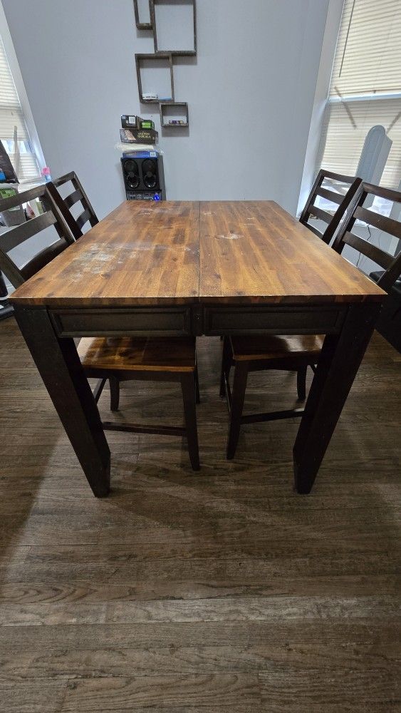This table was $1500 brand new it is super sturdy and durable. This is real oak. The top will need some tlc other than that it is a beautiful table. The middle opens to make it bigger. The dimensions are 76 inch by 36 inch.