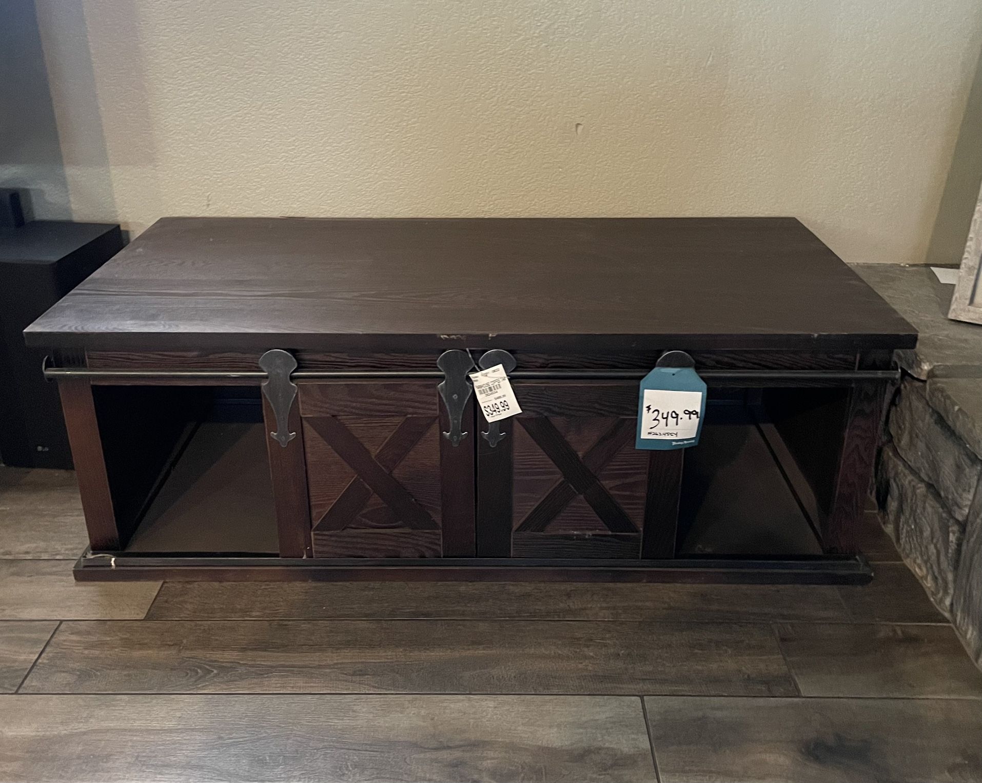 Good Rectangle Farmhouse Coffee Table with 2 great Mesh Sliding Barn Doors with 1 great Sliding Shelve; size height 3ft 11in and width 2 ft for Living Room, Bedroom, Apartment or Studio! $75.00 or best offer! You come pick up!