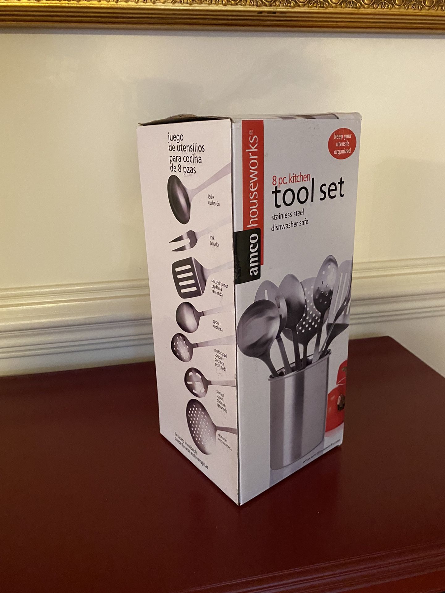 8pc Kitchen Tool Set, metal container-round, spatula, LH drainer, ladle, fork, spoon, slotted spoon, drain spoon
