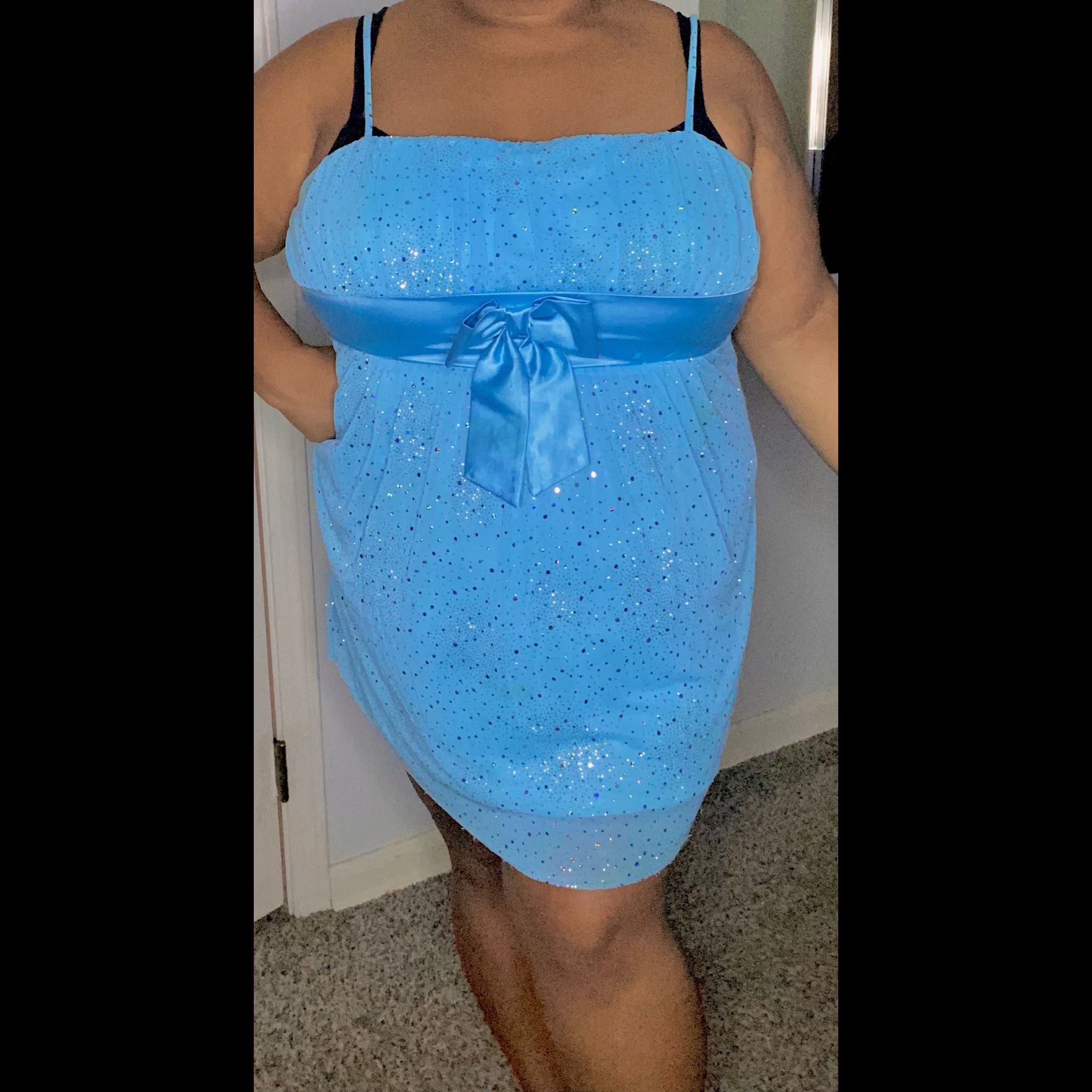 READY TO SHIP! Homecoming / Prom Baby Blue Plus Size Sparkly Mini Dress size 1X / 2X super cute pull on mini dress with sparkly spaghetti straps and bodice. Finished off with an adorable dating now at the front. Would fit better on someone with a smaller bust.