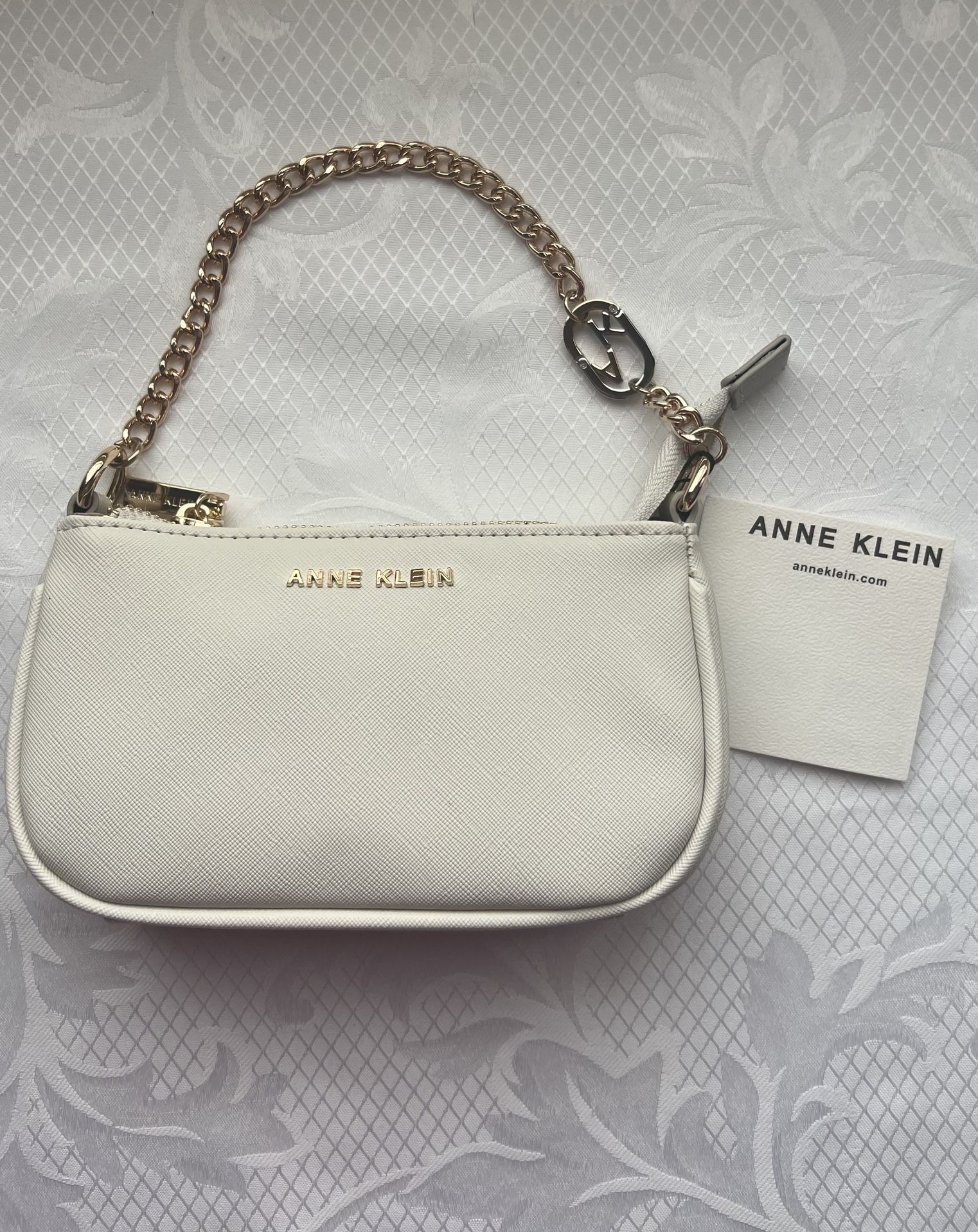 This is a brand new Anne Klein purse, specifically a mini crossbody style, featuring a cream or ivory finish with a gold-tone chain strap. You can use it as a clutch or crossbody. Great to give as a gift! Retail price is $65.00. (I work out of Escondido and Temecula)