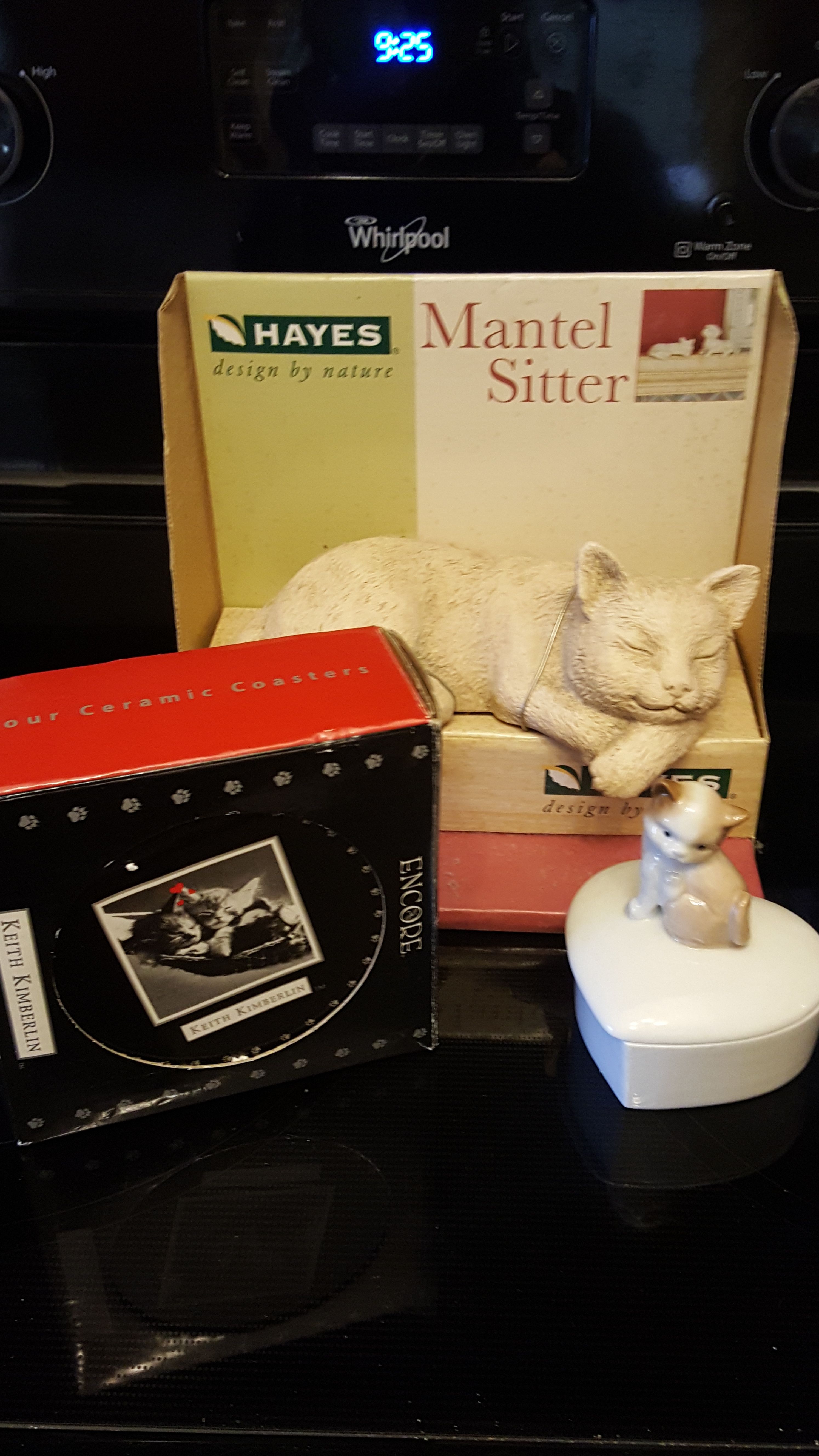 Includes new resin cat shelf sitter, set of 4 new ceramic Keith Kimberlin kitten coasters and vintage Otagiri Japan kitten trinket dish