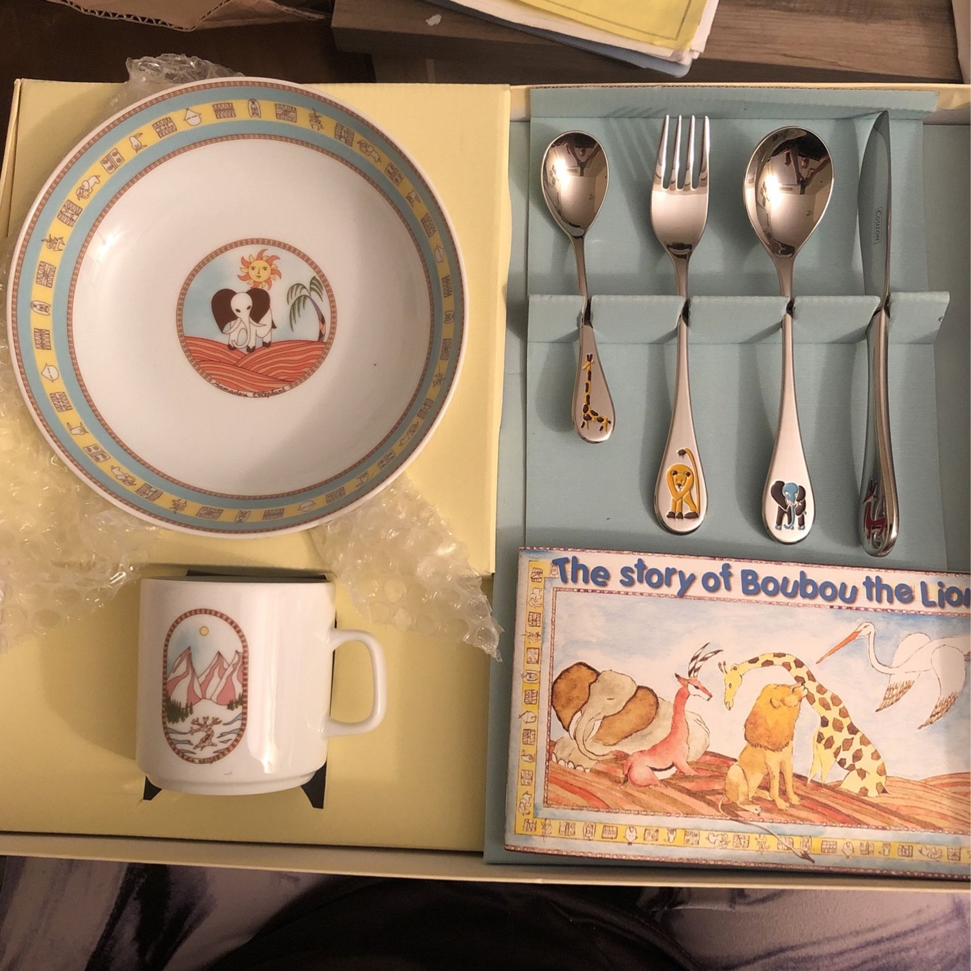 Couzon Les Couverts conteurs dish, cup and silver set. Great gift for new baby or baptisms! Never been used.
