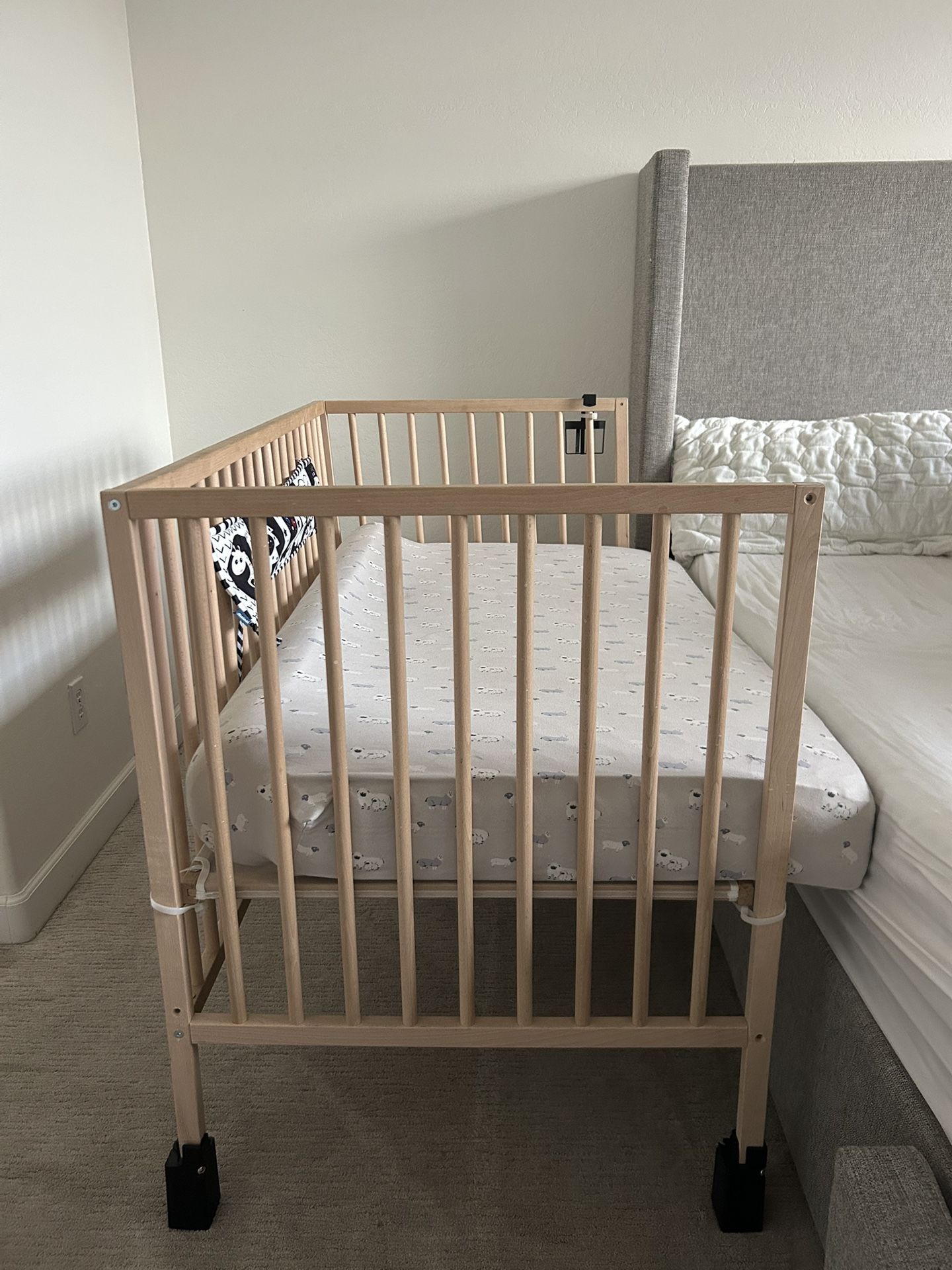 Selling in EUC sidecar crib I used to cosleep with my baby. It’s an IKEA Snigler crib that I used without the other side (I have this piece and will include it with the sale). I used bed risers to make the crib mattress level with our mattress which is included along with a toddler bed bumper I used to fill the gap between the crib for safety. I also attached a cup holder which fit my Stanley comfortably which is also included along with the black & white cloth pictures and Kyte baby crib sheet and Sealy mattress. -IKEA Sniglar crib -Sealy crib mattress -bed risers -toddler bed bumper -Kyte baby bamboo crib sheet (Lamb) -cup holder -b&w crib pictures Over $325 for all of this new not including tax and I’m saving you the time of having to build the crib 😉