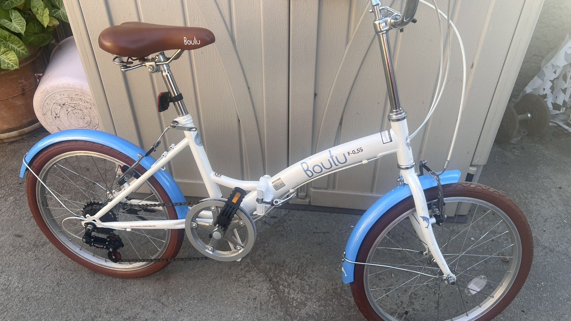 White frame , blue fenders and brown saddle. Folding bike for portable and compact space
