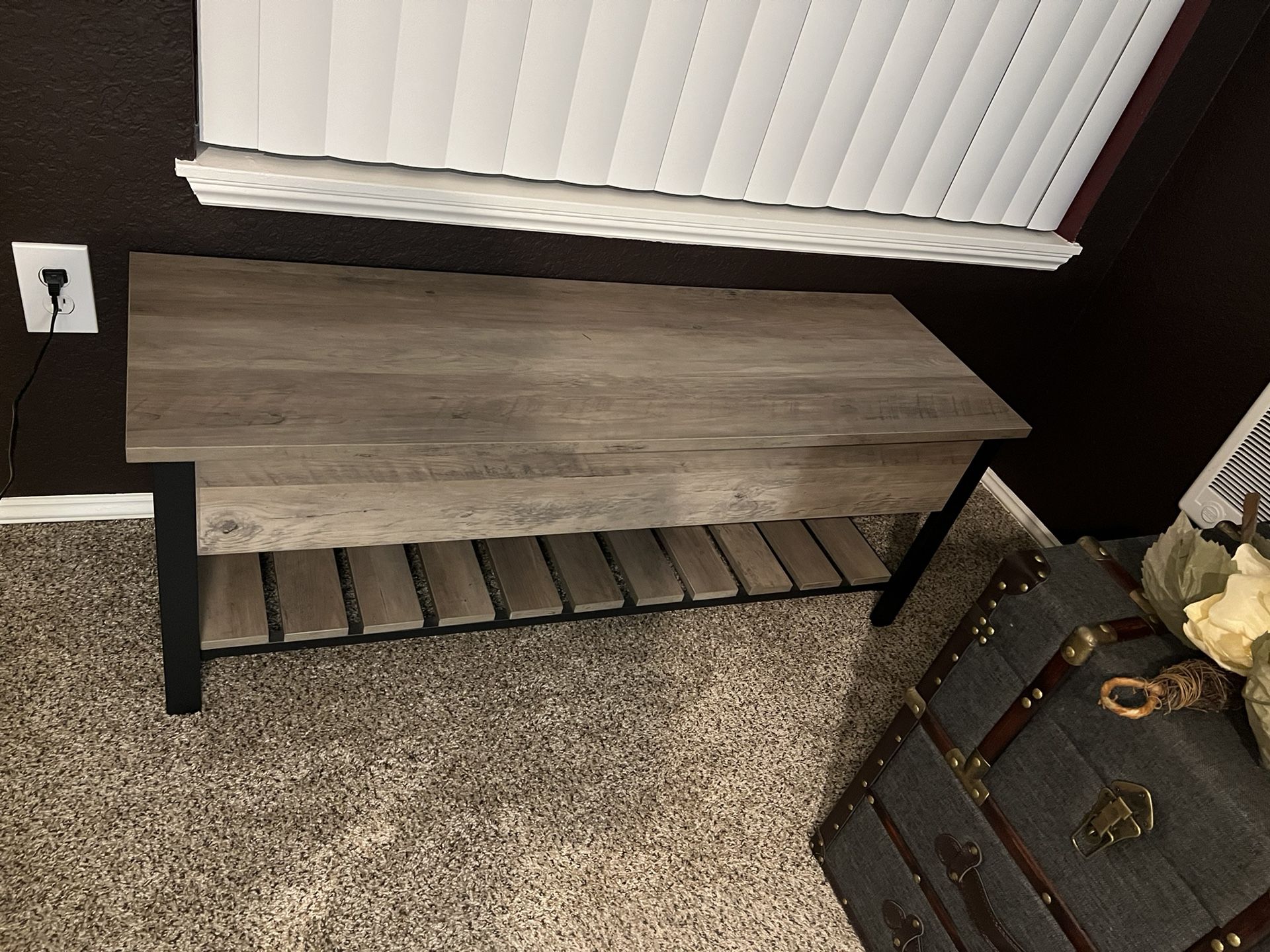 Grey wood and black metal storage/bench/ shoe rack. Great condition! No longer need. Dimensions: 48 inches length x 16 inches depth x 18 inch height.