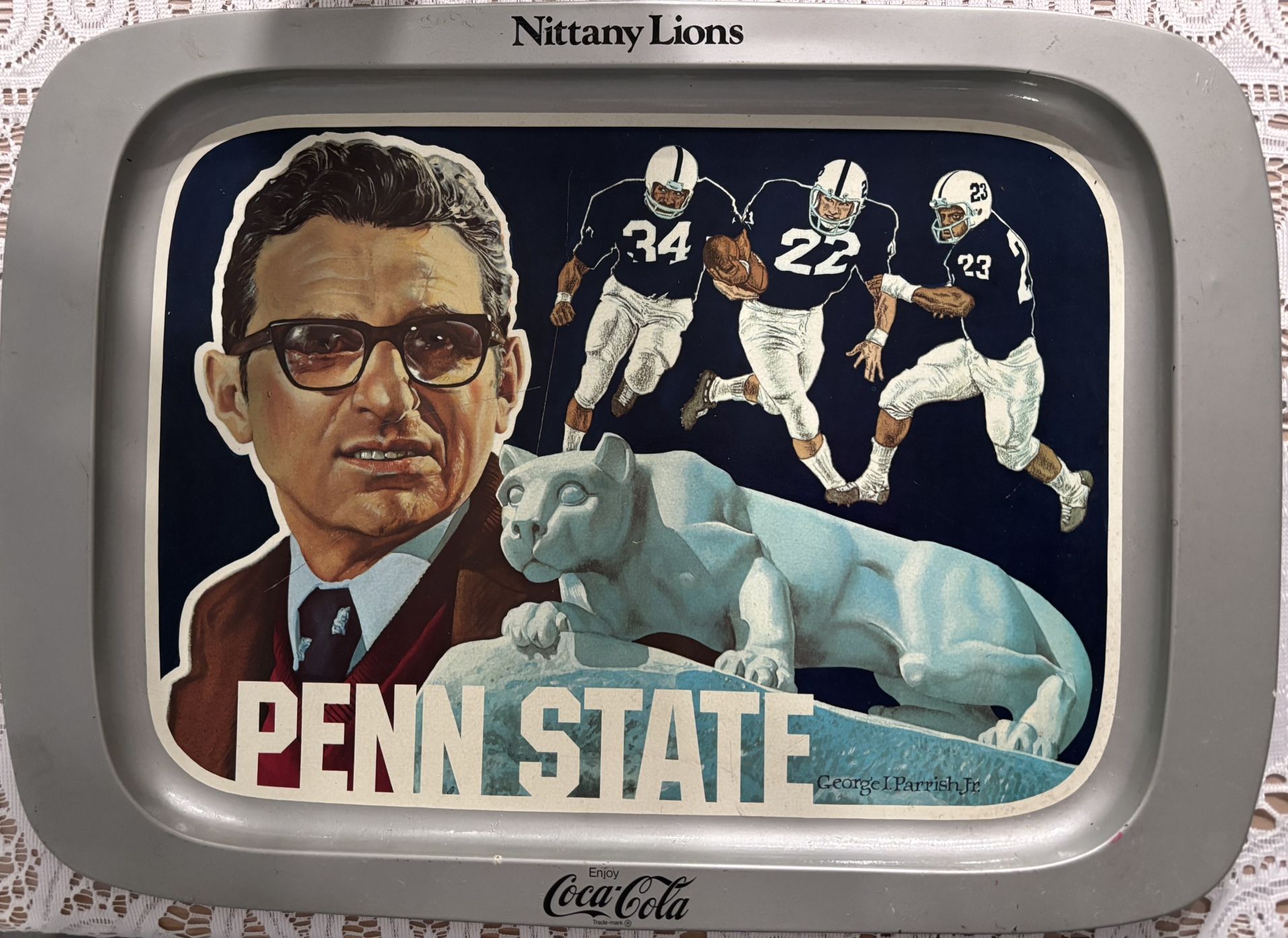 PENN STAYE NITTANY LIONS METAL TRAY. JOEPA and 3 players on front. All-America Selections, Joe’s History, Legend of NITTANY Lion and Results on the back. No16182
