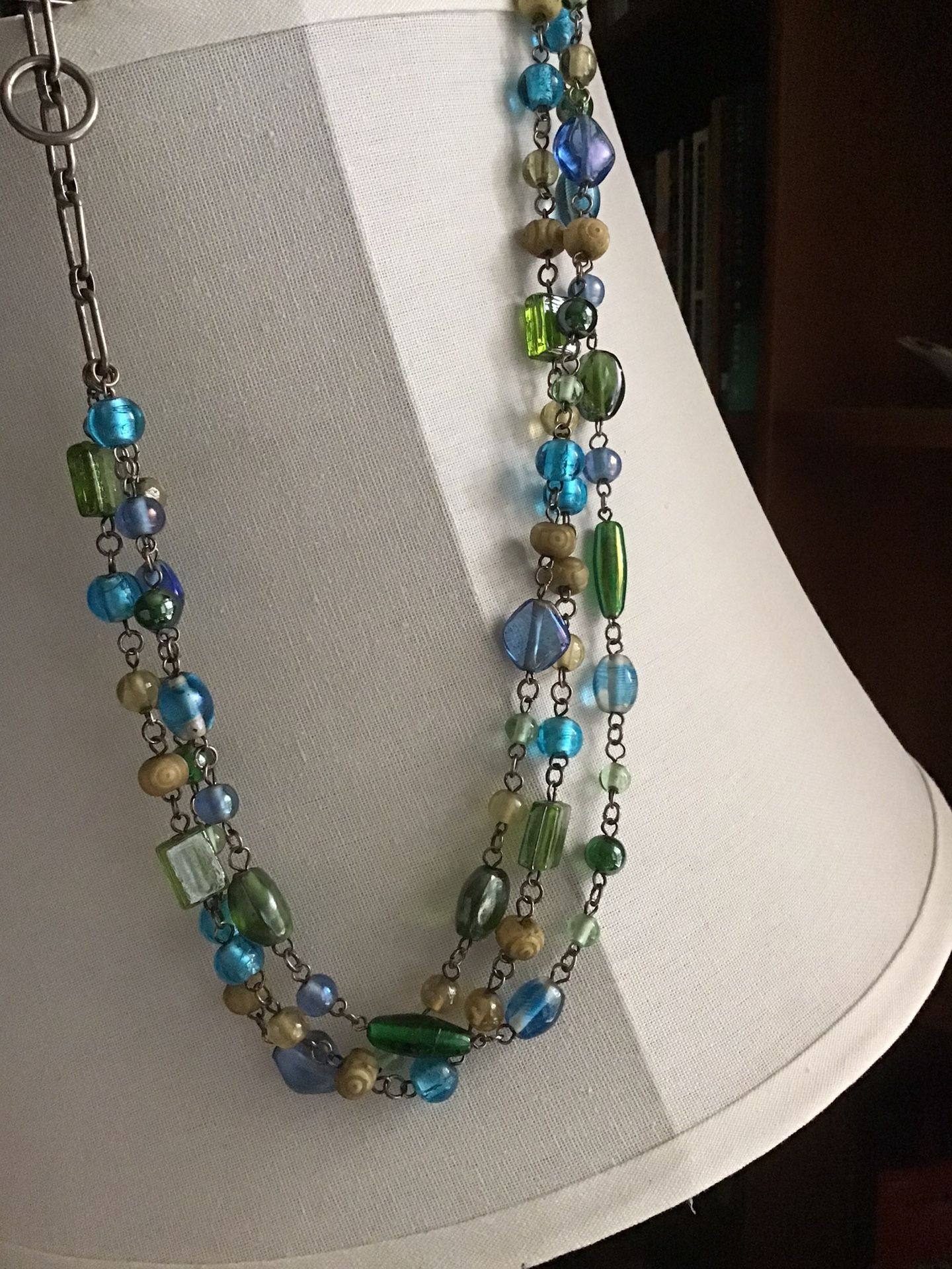 Colors , green , blue , bage , 20” - 3 strand , expend , like in Ocean Water.