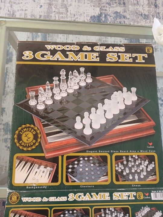 Elegant Wood and Glass: Three Game Set. By CARDINAL - LIMITED EDITION It is a 3-in-1 board game set that includes chess, checkers, and backgammon. The game board is made of glass set within a wooden frame. The set includes all necessary pieces for the three games, such as 32 chess pieces and 30 checkers/backgammon pieces. The board is designed with a modern aesthetic, suitable as a decorative piece as well as a game set. New in the original box and sealed plastic. Thank you for viewing