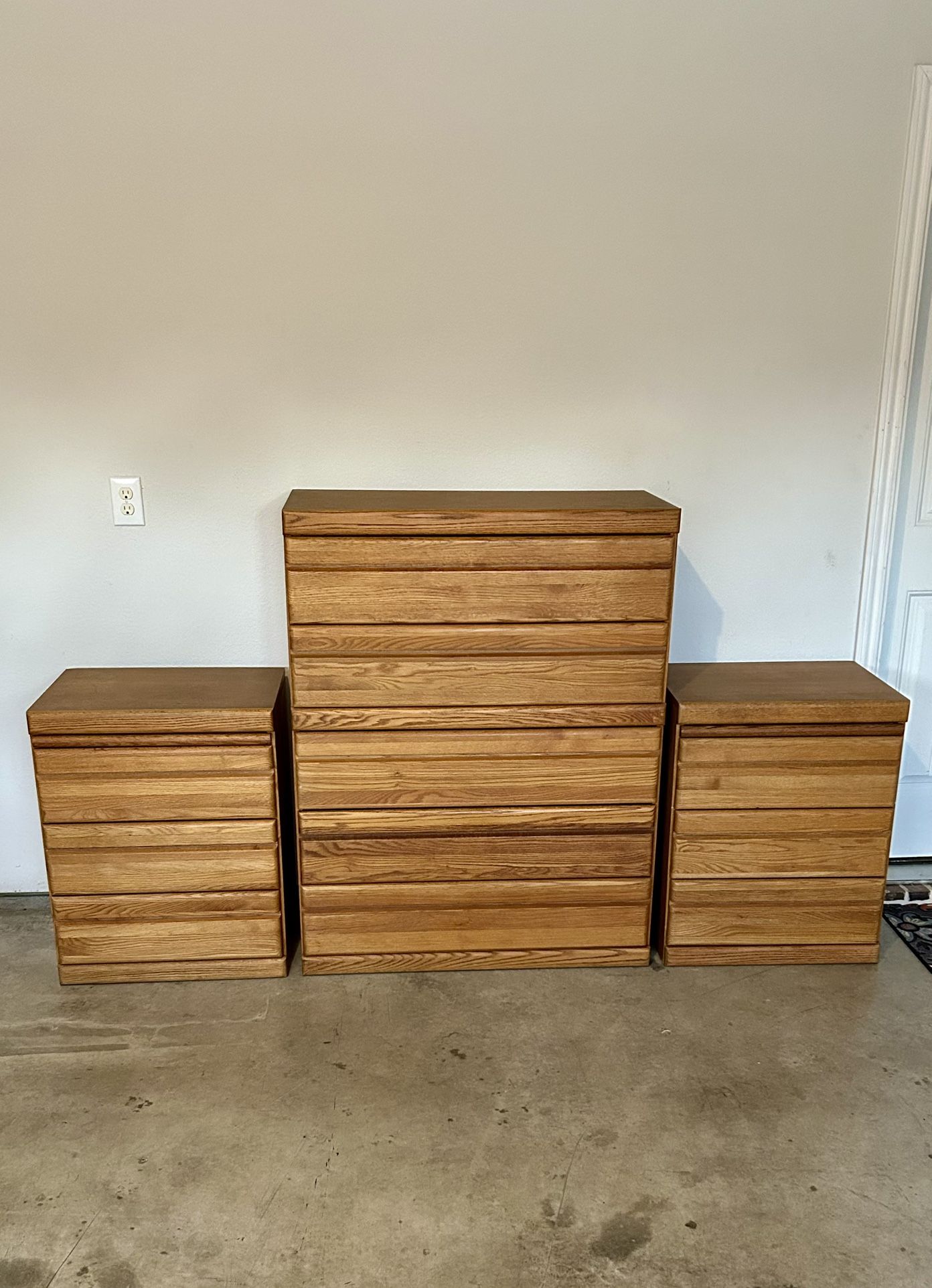 2 nightstands 22 1/2”x28 3/4”x16 3/4”. Tall dresser 36”x 46 1/4”x16 3/4”. Long dresser 71 1/4”x36 1/4x16 3/4”. Approximate measurements. All dresser’s top drawer includes cedar bottom. Both dressers have hide-a- shelf within top shelf. Nightstands both have pullout table top. Please see pictures. Asking $150 OBO