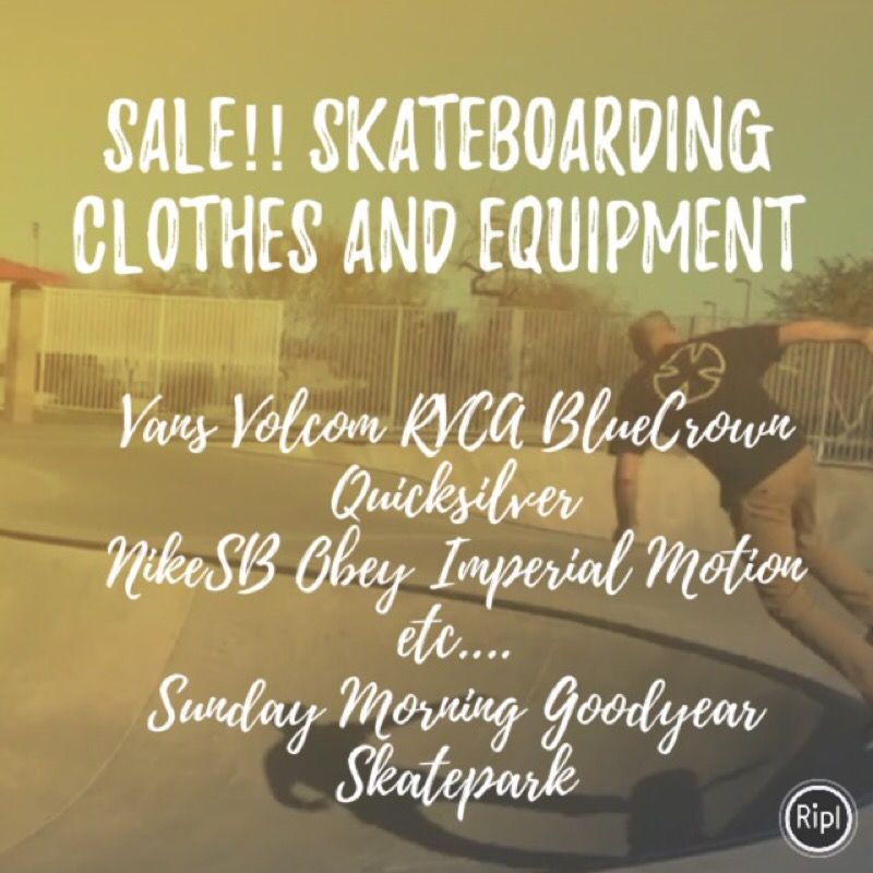 T's $5 Pants $10-15 Button up Shirts $5-15 Shoes $5 and up Shoes sized youth 12 to adult 13 Pant size Youth small to adult 32 Shorts size 26-36 Button up size Youth to adult XL To much to list separately!! Come by Goodyear Skatepark in the morning (Sunday 26th) and check it out. I will be skating in the park until 11ish then I will lay the stuff out. I'll leave a number on the white Ford 150 to message me if you want to get there earlier and I'll come out.
