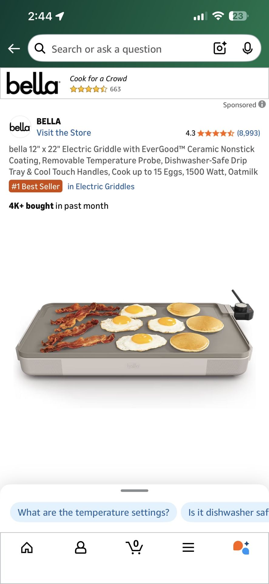 bella 12" x 22" Electric Griddle with EverGood™ Ceramic Nonstick Coating, Removable Temperature Probe, Dishwasher-Safe Drip Tray & Cool Touch Handles,