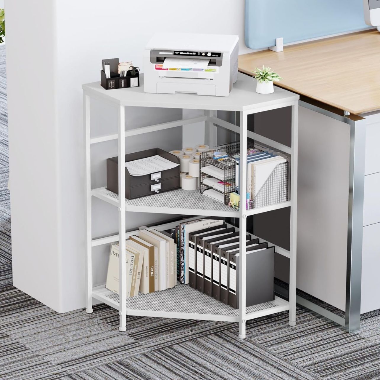 20"x20" Corner Printer Stand with Charging Station, Adjustable Height Storage Shelf for CPU Shredder, Triangle Corner Coffee Table for Small Space Kitchen Office Living Room-White