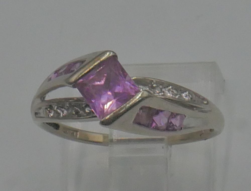 1OKT WHITE GOLD RING SIZE 7 2.1 GRAMS 2 SMALL DIAMONDS PINK STONE. 866358-3.