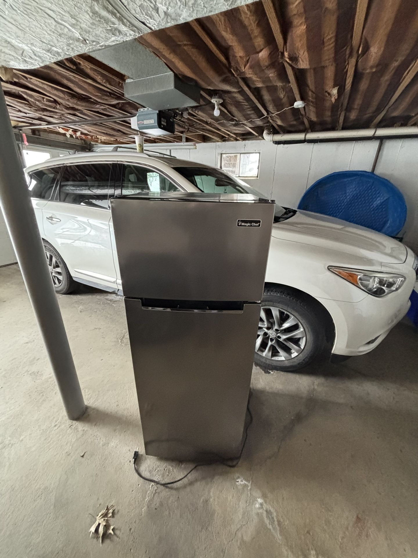 Smaller sized Fridge and Freezer combo. Large dent on back right of fridge (see picture) completely cosmetic and doesn’t affect functioning at all.