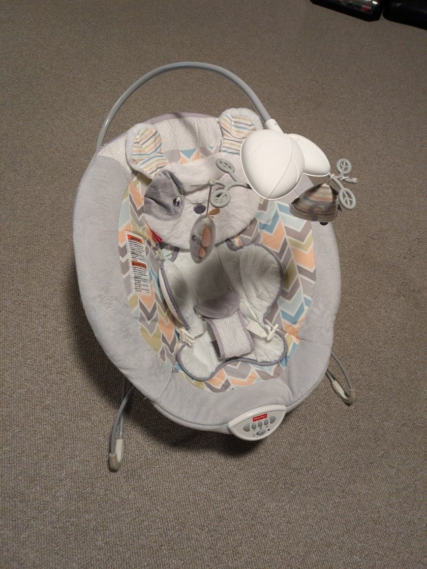 Fisher-Price Snugapuppy deluxe bouncer, portable bouncing baby seat with overhead mobile, music, and calming vibrations. Smoke free home. No rips or damage. $15 cash. Pick up only.