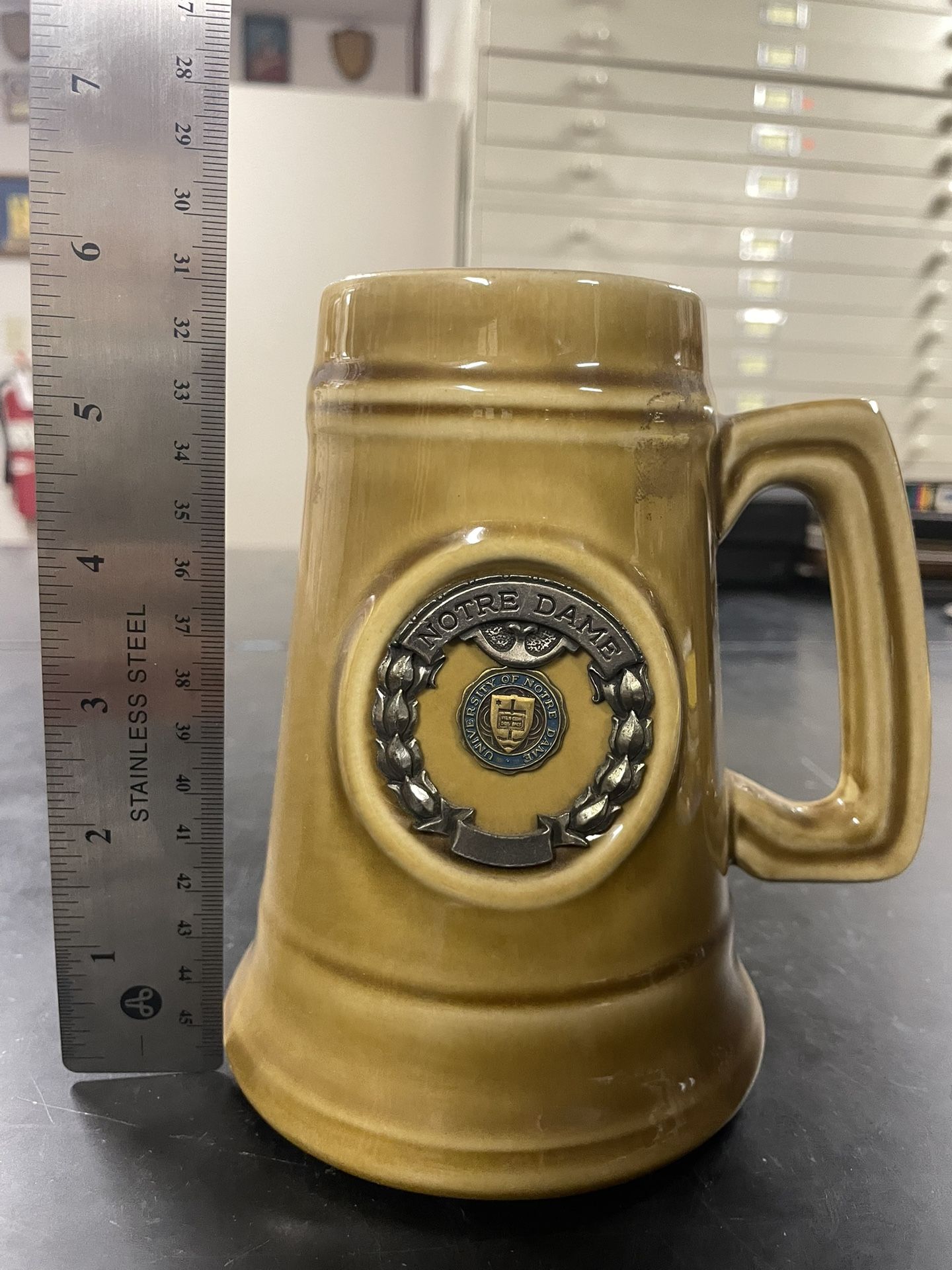 6 inches tall, 4 1/2 inches diameter base, 2 1/2 inches diameter mouth. Tan finish.