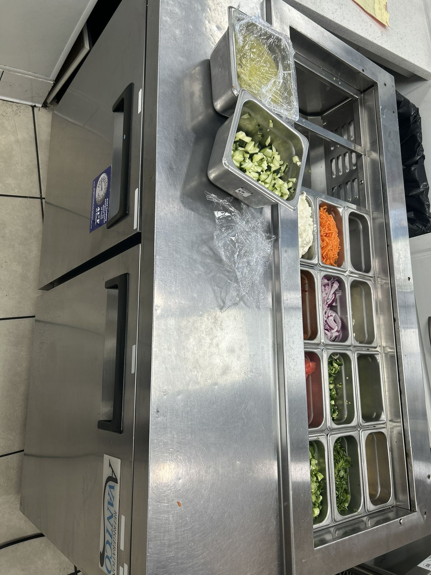 Features an aluminum interior with 304 stainless steel floor Top holds up to (12) 1/6 size, 6" deep food pans (sold separately) Two self-closing swing doors with recessed handles Includes a removable, full-length 11 1/2" deep cutting board 115V; 1/4 hp