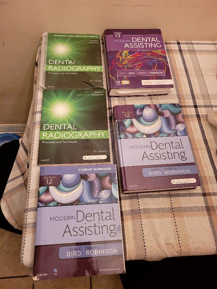 Complete set of textbooks to study Dental Assistance. Books by Bird and Robinson. Editions 12 and 13 plus Dental Radiology: Principles and Techniques Book and unopened workbook. 5 books in total.