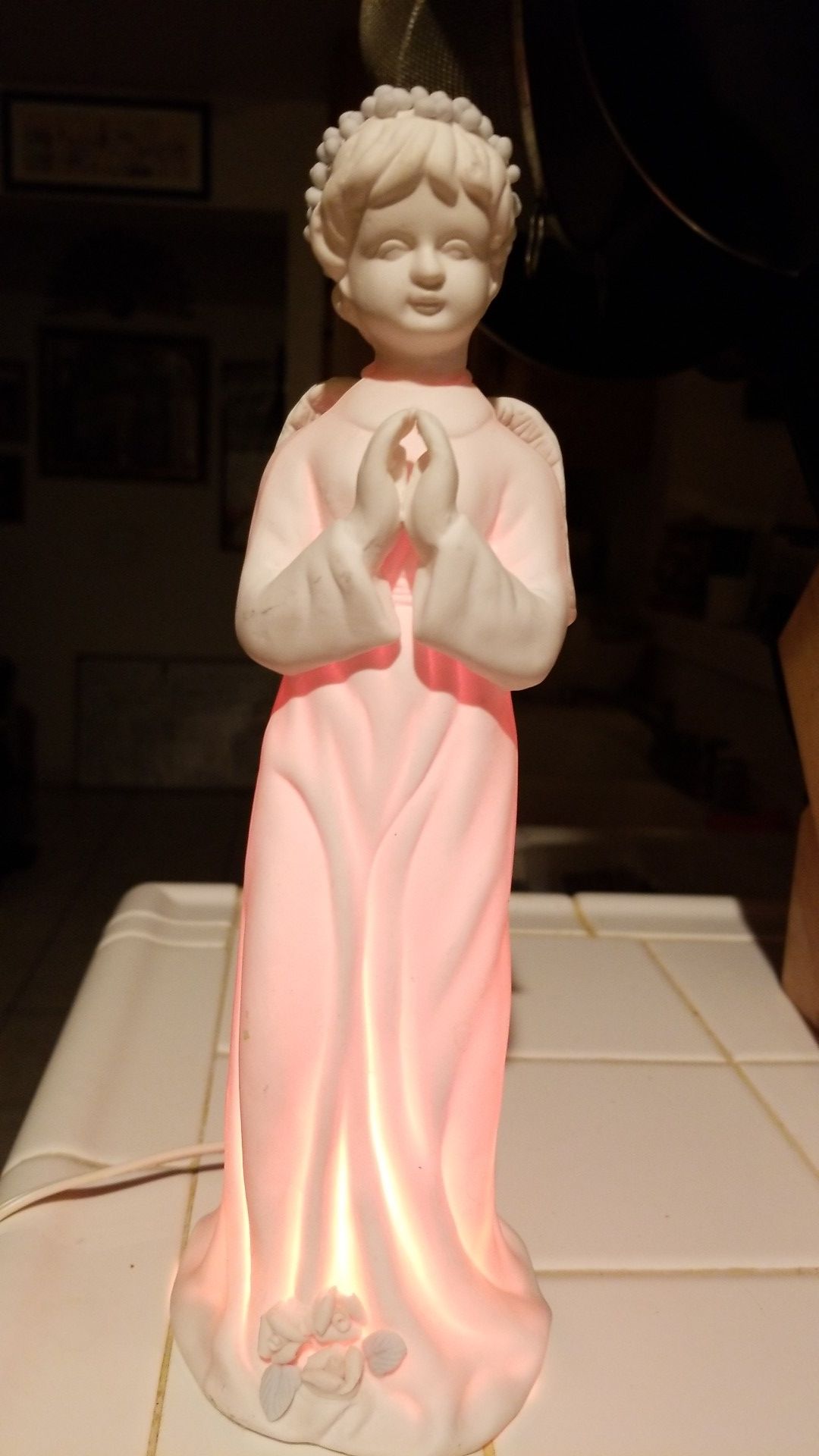 Angel night light with bulb and plug to wall. Size: Length 10 in. Base: 3 in. across Good condition. Pick up in victorville.