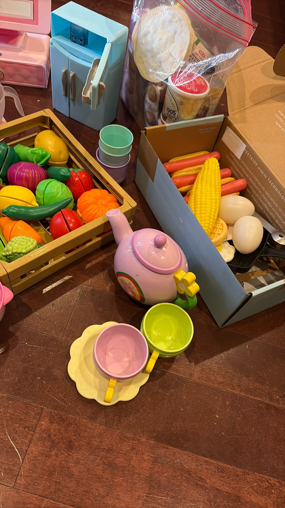 Basket of vegetables Peppa Pig coffee pot with 2 cups cash register with money makes noise microwave makes noise with new batteries, box and bag of groceries. Used good condition. CASH only Carry No change. Sold separately. See other posts for pictures of microwave(white ) and cash register (pink )