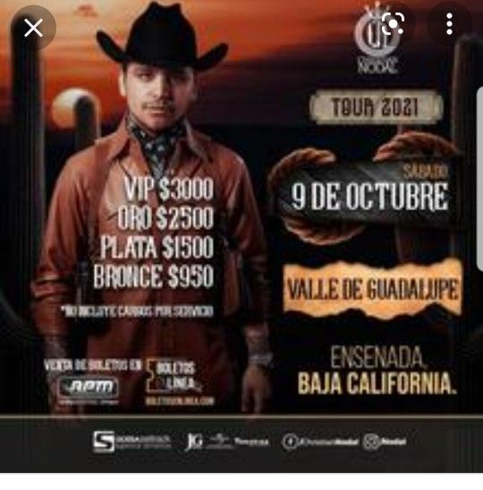 2 boletos para el concierto de Christian Nodal Sabado 9 de Octubre en Valle de Guadalupe...asientos VIP, concierto totalmente vendido $450 por los dos...