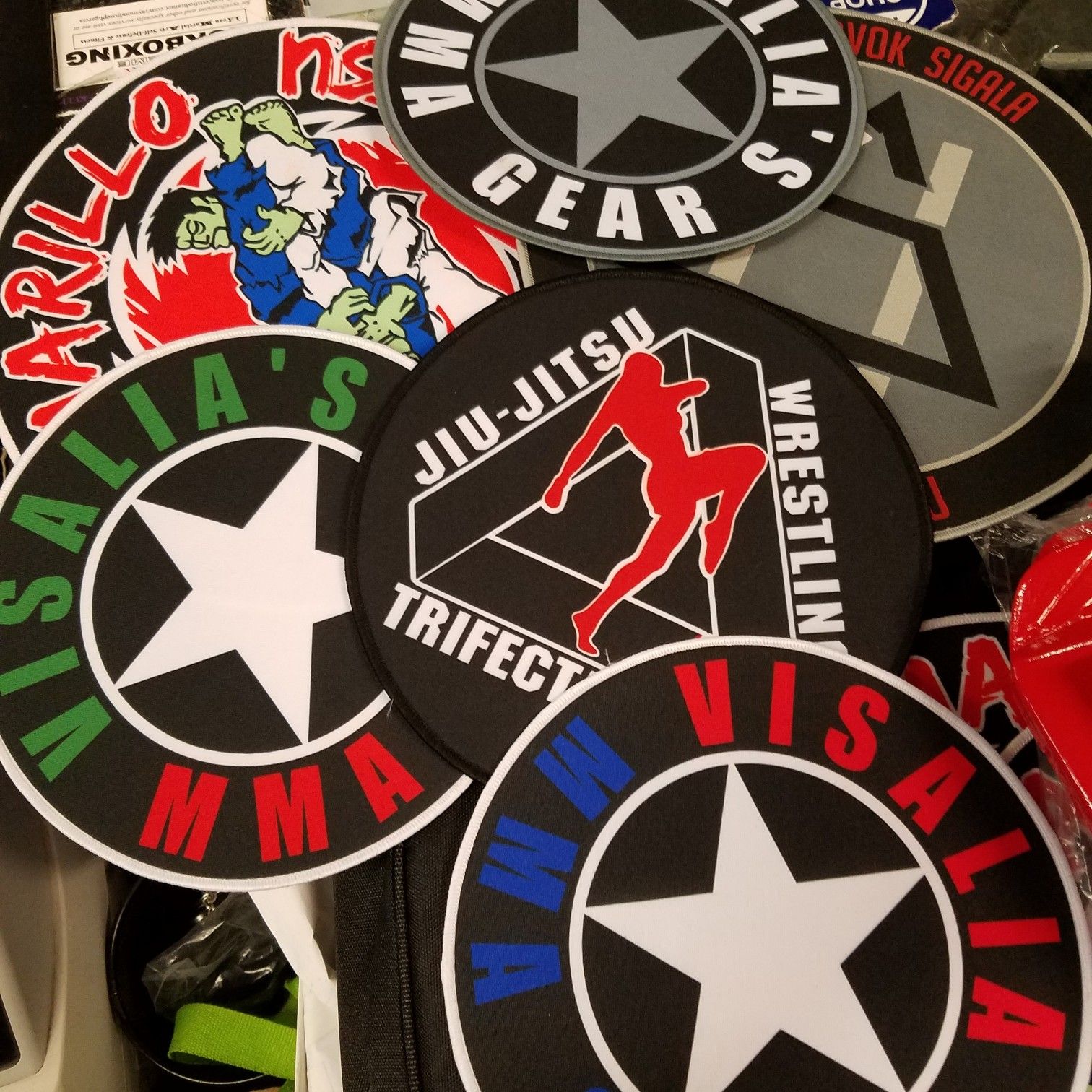 Custom patches. Up to 10 inch round. Sublimated. Minimum 25 pieces. $5 ea. Any design you want. 2 week turnaround.