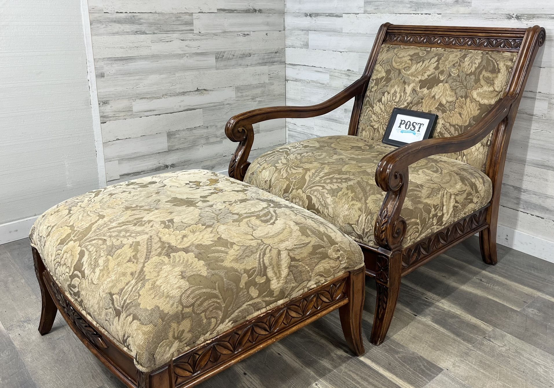 GuildCraft Vintage Bergere Chair and Ottoman. This large size living room chair is great for lounging and reading. Kick your feet up and relax! Excellent pre owned condition. No rips or stains. Smoke free home. The wood has a few scratches but they blend well with the rustic carved detailing. Arm to arm - 33” Seat depth -27” Floor to seat - 19” Floor to top of chair - 38” Ottoman width - 33” Ottoman Depth - 28” Ottoman height - 19” Price- $150 located in Canby. No holds. Purchase directly through our website and view our inventory. Www.postfurnishings dot com